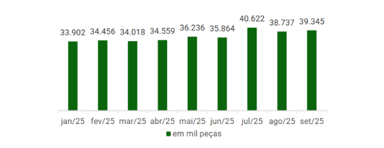 O consumo aparente do setor – somatório da produção doméstica destinada ao mercado interno mais importações – registrou 39,5 milhões de peças em setembro, avanço de 2,4% no mês. De janeiro a setembro, o consumo acumula +1,3%, bastante alinhado ao ritmo de produção. Em 12 meses, chega a +3,1%.