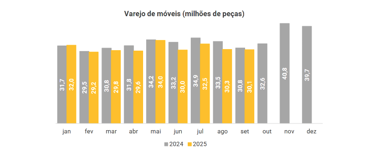 A participação das importações ficou em 5,8% em setembro, refletindo o câmbio mais estável e a recomposição gradual das cadeias logísticas internacionais. Porém, o varejo doméstico segue em compasso mais lento: as vendas de móveis e colchões caíram 0,4% em setembro, acumulando –4,4% no ano em volume. Em valores, a queda é menor ao longo de 2025 (–1,3%), sustentada por ajustes inflacionários e por um mix de produtos de maior ticket.