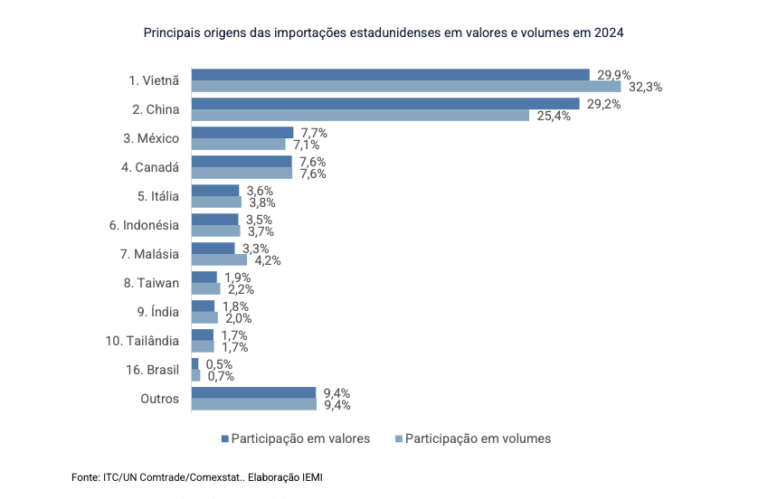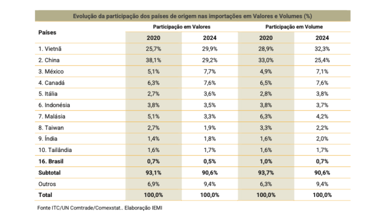 O Brasil ocupou a 16ª posição, com 0,5% de participação em valores e 0,7% em volumes, perdendo ligeiramente espaço em relação a 2020. Indicador, aliás, que confirma um dos principais pontos da defesa brasileira contra o tarifaço imposto pelo governo americano, demonstrando que as importações de móveis brasileiros não representam risco à segurança nacional dos EUA.