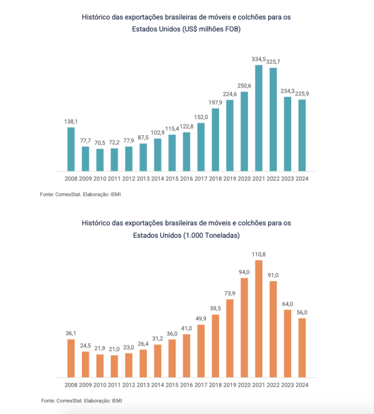 Segundo levantamento do IEMI, as exportações brasileiras de móveis e colchões caíram -14,5% em agosto de 2025, primeiro mês de vigência das novas tarifas. Especificamente no caso dos móveis prontos exportados aos EUA, a queda foi de -22% em relação a julho e -26% frente ao mesmo mês de 2024.