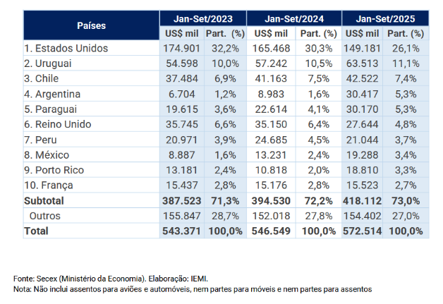 Entre os principais estados exportadores, Santa Catarina respondeu por 34,1% das exportações totais no período, seguido por Rio Grande do Sul (30,7%), Paraná (18,8%), São Paulo (13,2%) e Minas Gerais (1,4%). Juntos, esses cinco estados concentram mais de 98% das vendas externas do setor.