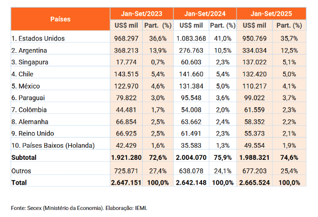 Os principais destinos ao final do terceiro trimestre foram os Estados Unidos (35,7%), a Argentina (12,5%) e Singapura (5,1%).
