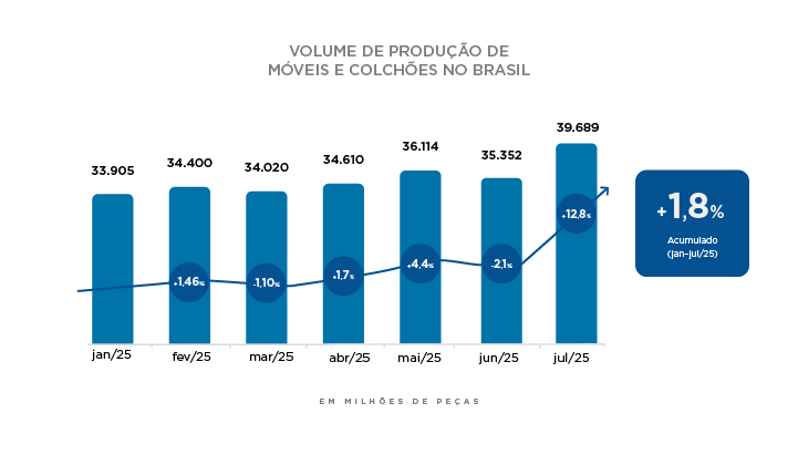 O volume de produção de móveis e colchões alcançou 39,7 milhões de peças em julho deste ano, representando alta de +12,8% em relação a junho. Ainda assim, o avanço acumulado no ano desacelerou — passando de +2,6% no primeiro semestre para +1,8% até julho. Em 12 meses, a produção soma expansão de +5,5%.